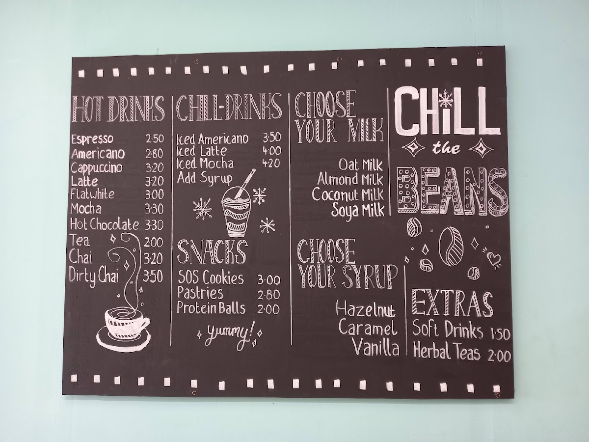 This cafe menu features a selection of coffee-based beverages and light snacks suitable for breakfast, coffee breaks, or casual light meals. Visitors can choose from a variety of cappuccinos including hazelnut, caramel, and vanilla flavors, as well as other coffee drinks such as caramel latte. For those looking for sweet treats, the menu includes options like SOS cookies, chocolate cookies, and chocolate cake, alongside protein balls for a snack with added nutrition.